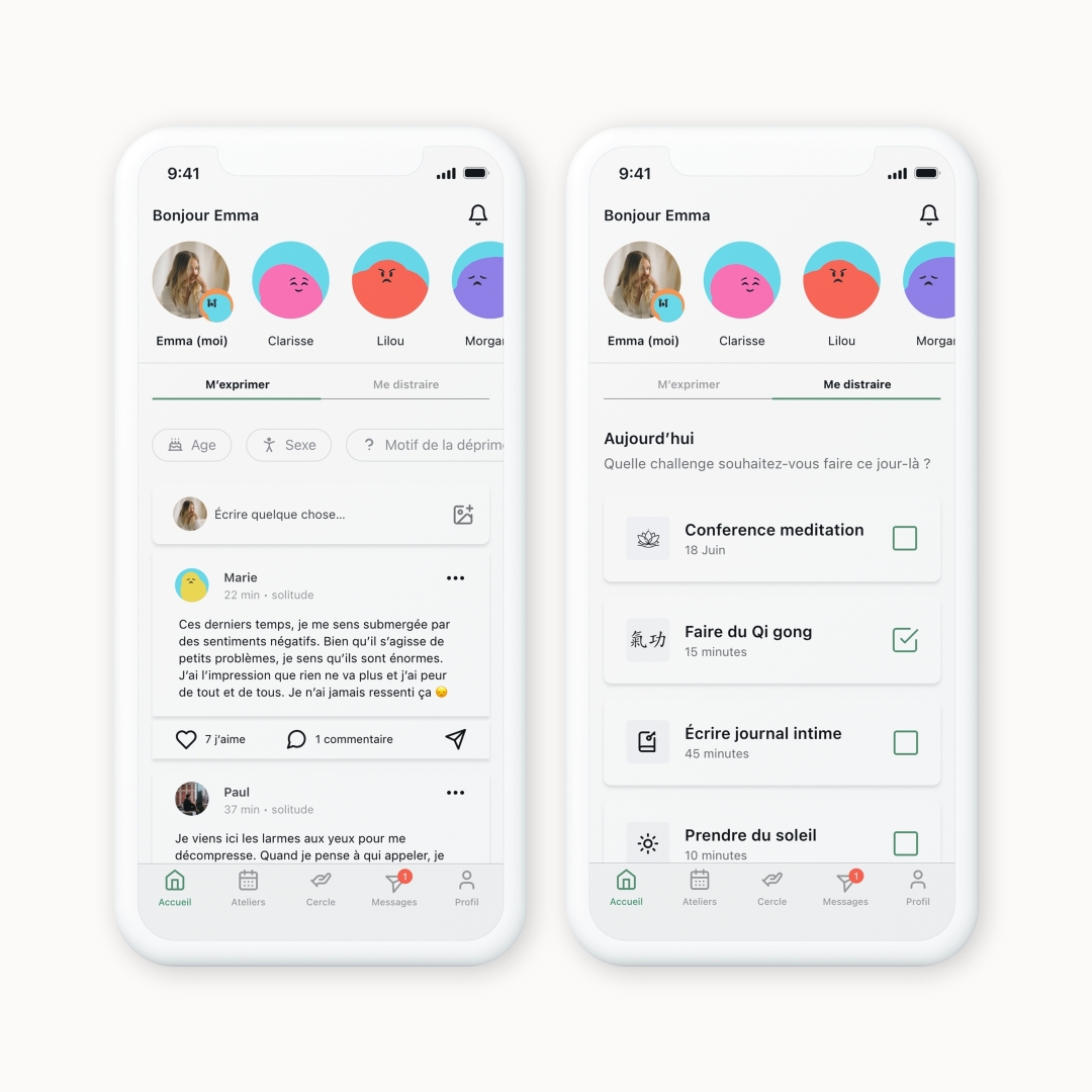 Dans le feed, l’utilisateur (de façon anonyme ou pas) aura le choix de s’exprimer ou partager son histoire et identifier des points en commun avec autres utilisateurs.
